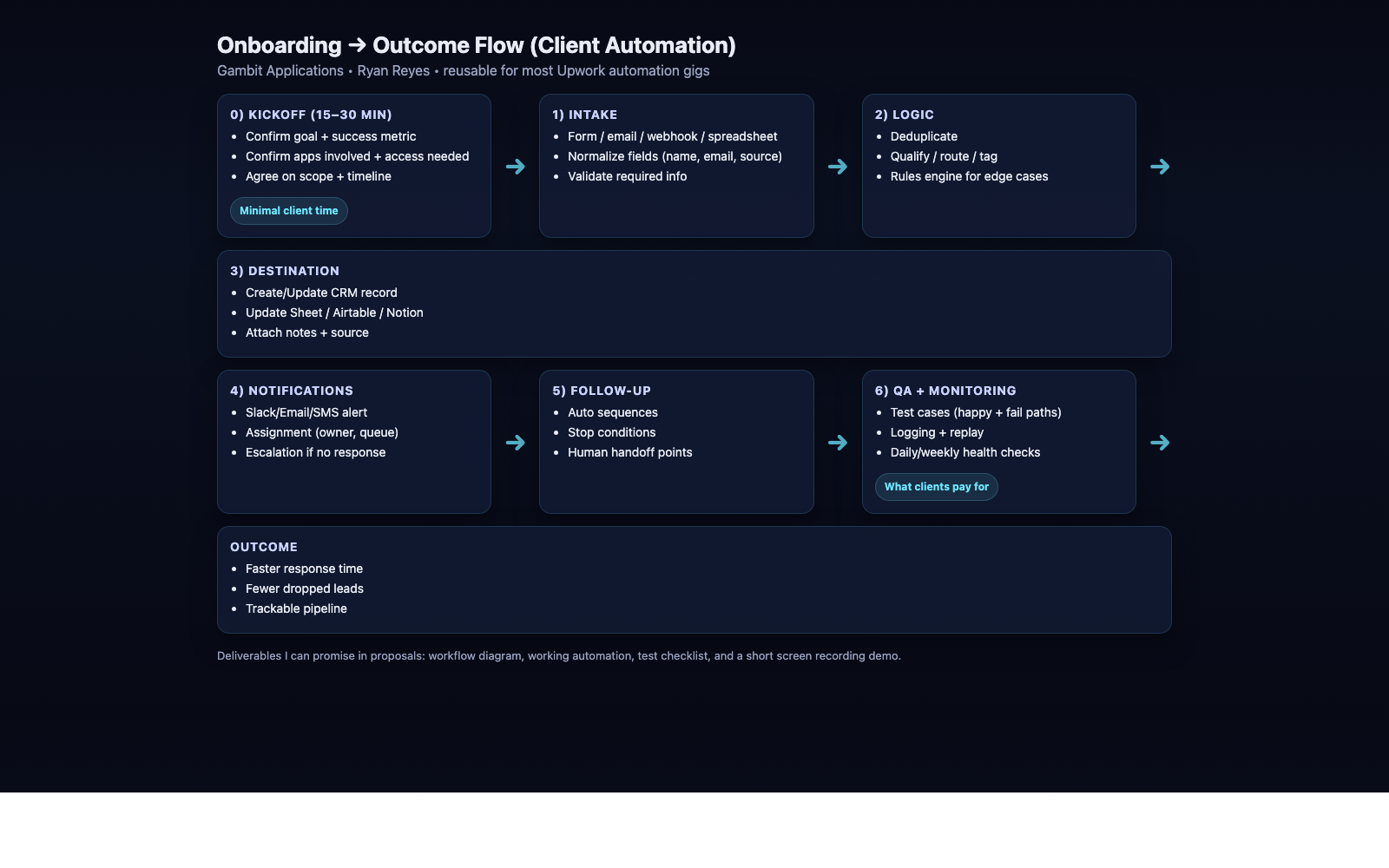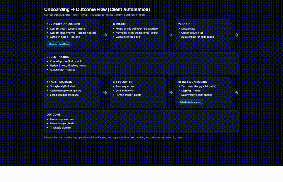 UpworkReusable Upwork proof asset: intake → logic → destination → notifications. Includes diagram + short MP4/GIF.